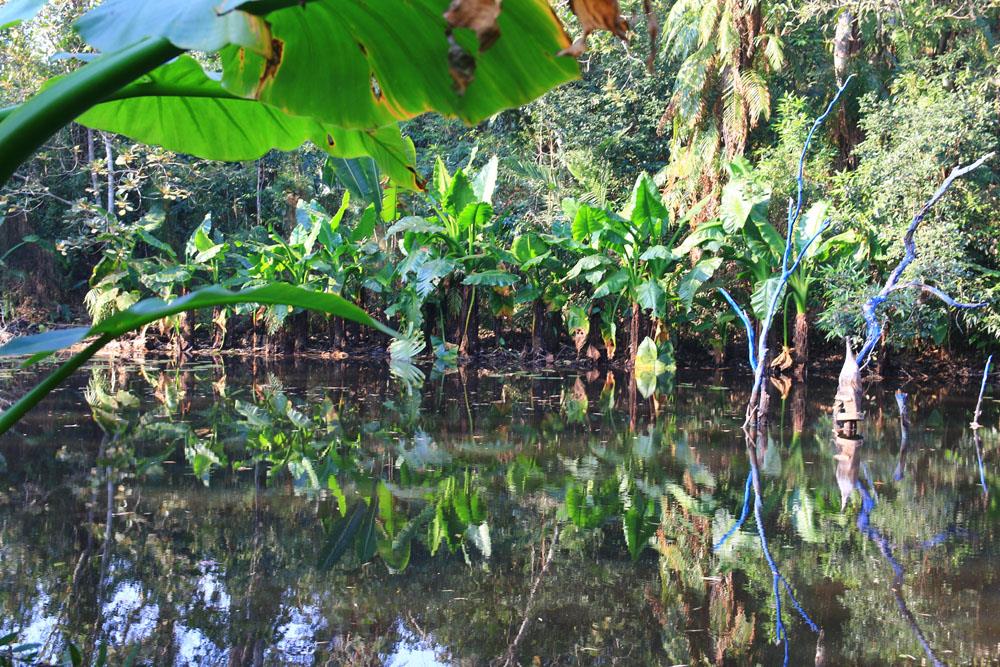 手前と遠くに生える大きな葉の木「Elephant ear tree」。トトロみたく傘にできそうってガイドさんに言うと、「できそうなんだけどね、しばらく持ってると手がかゆくなっちゃうんだよね」って。残念…!